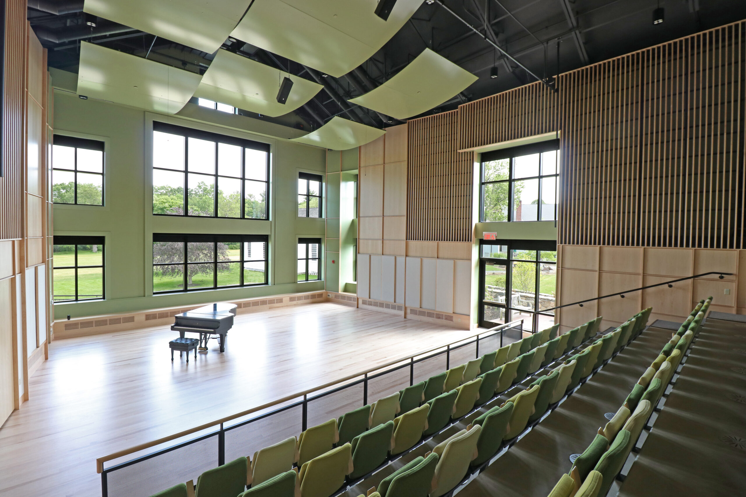 With creative arts at its core, Concord Academy partnered with Windover, DSK Architects, and a team of industry-leading to create a state-of-the-art performing arts center on its West Campus that would transform the student experience. Windover supported Concord Academy through preconstruction alongside DSK Architects, and managed the construction of the state-of-the-art facility, which includes a 125-seat music hall, a 175-seat theater, ensemble and practice rooms, a set shop, and a significant backstage area to support large-scale productions. Seats within the theater and music hall are all retractable, allowing flexibility to transform the spaces for dance performances, movie screenings, classes, and meetings. Additionally, there are recording and productions studios equipped with technology used in the industry today. Focused on sustainability and building for the future, the Centennial Arts Center has a zero-carbon certification standard, fossil-fuel-free climate system, and a solar-ready roof.